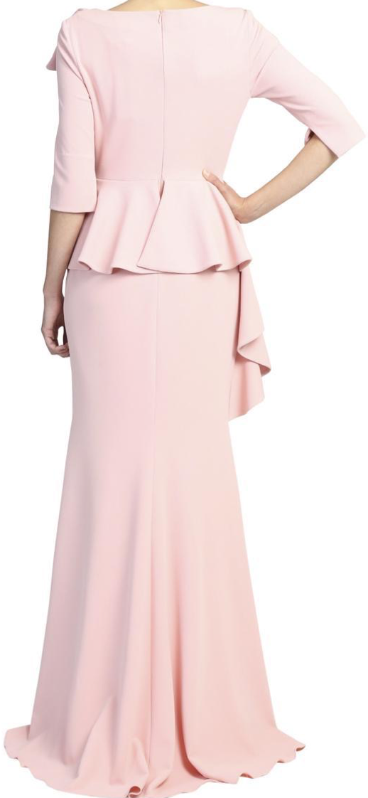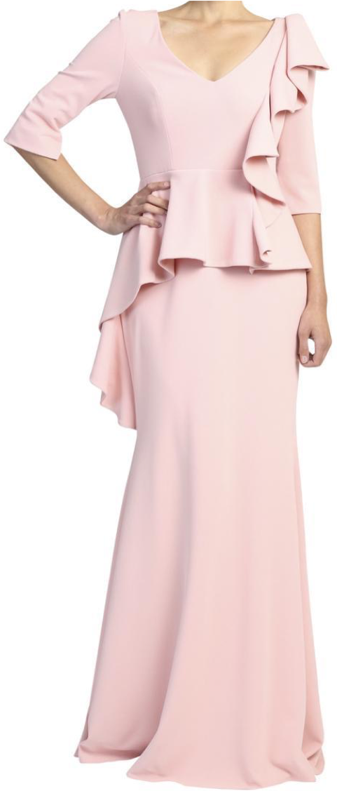 Elbow sleeves full-length ruffle front evening dress blush pink