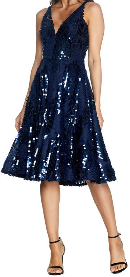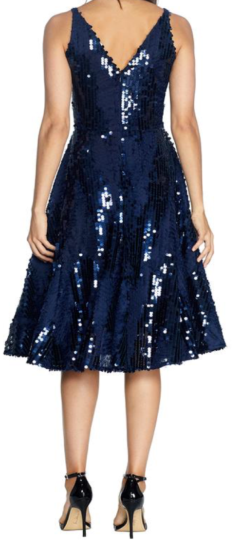 Sophie plunging bodice fit flare v-neck sequin sparkle midi blue